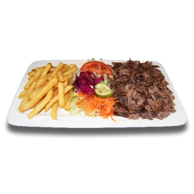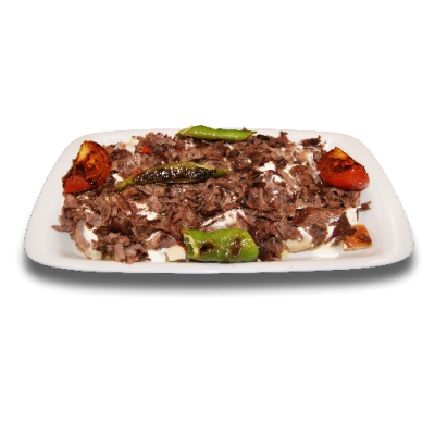 Tomatensaus, kaas, kebabvlees, ui en paprika