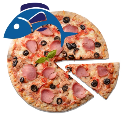 Tomatensaus, kaas, tonijn, scampi’s, inktvis, gerookte zalm, paprika en knoflook
