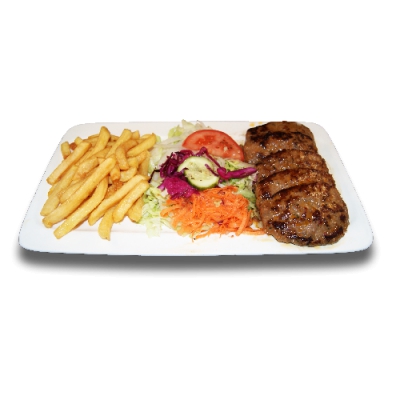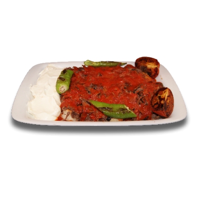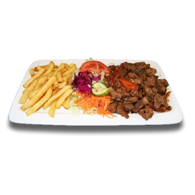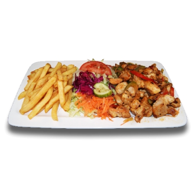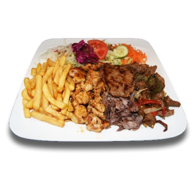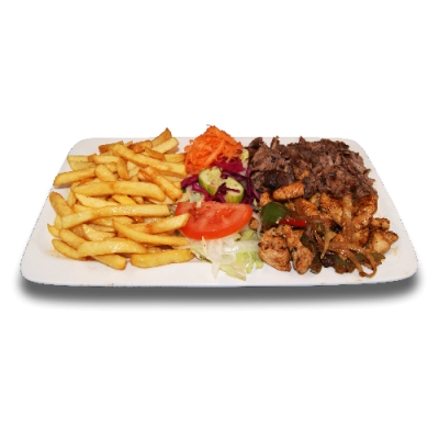 Tomatensaus, kaas, kebabvlees, kip, ui en paprika